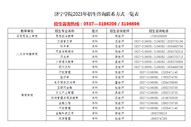 您现在的位置: 山东职教高考网 >  招生院校 > 济宁学院 > 学院动态  > 济宁学院2023年招生咨询联系方式一览表